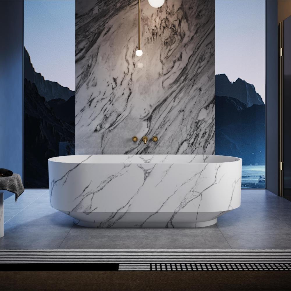 This luxury marble effect freestanding bathtub combines modern design with timeless elegance. Featuring a smooth oval shape and a sophisticated stone-inspired finish, it creates a striking focal point in any luxury bathroom. Crafted for comfort and style, the spacious interior offers a relaxing soaking experience, while the solid surface construction delivers a seamless look and premium feel. Ideal for high-end residential, hotel, and villa projects, this modern freestanding soaking tub is designed to elevate contemporary bathroom spaces.