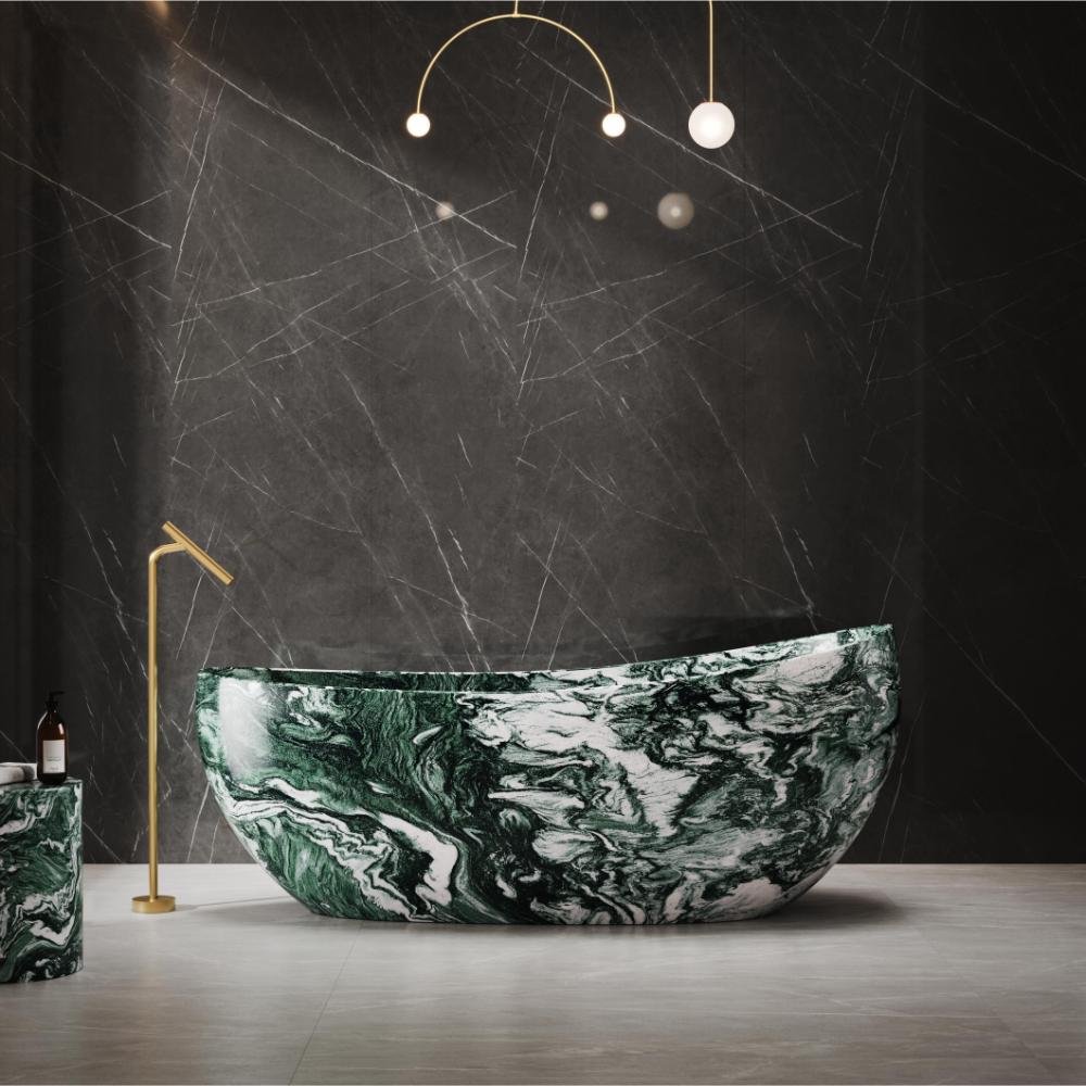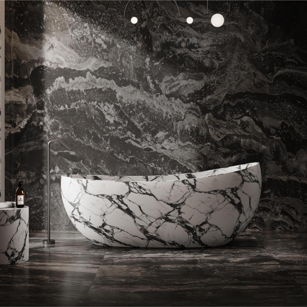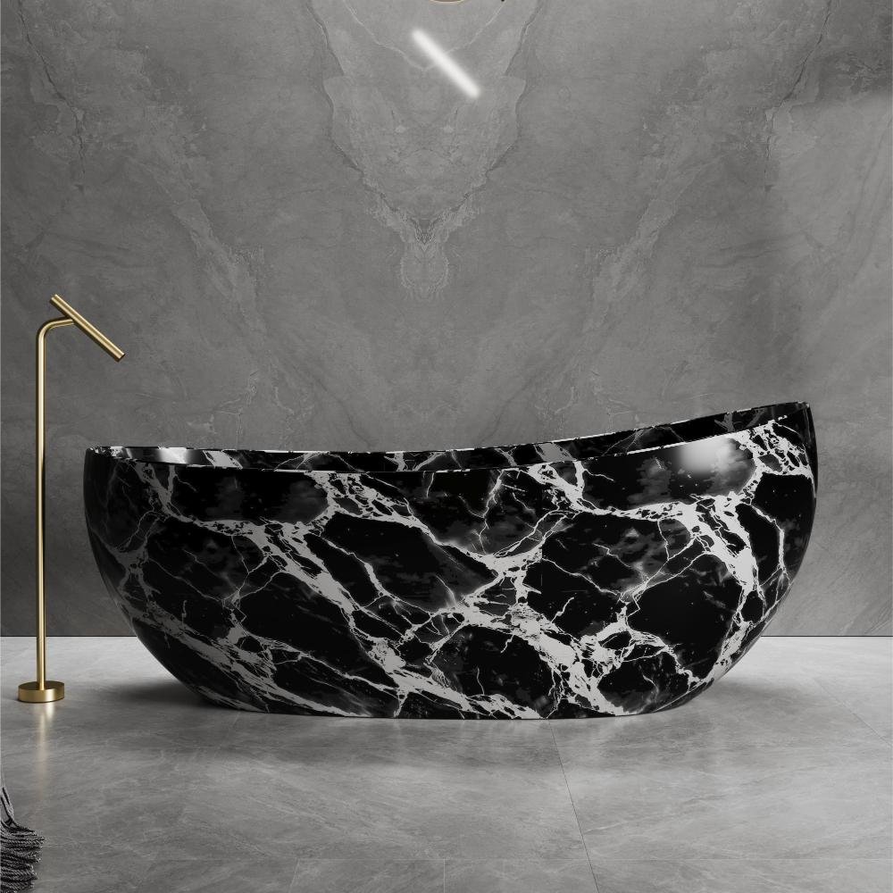 This solid surface bathtub is inspired by the dramatic beauty of natural stone, combining bold marble-like veining with contemporary craftsmanship to create a striking centerpiece for modern bathrooms. Its elegant silhouette and smooth curves are designed for ergonomic comfort, offering a relaxing and immersive bathing experience.