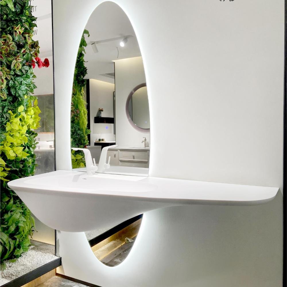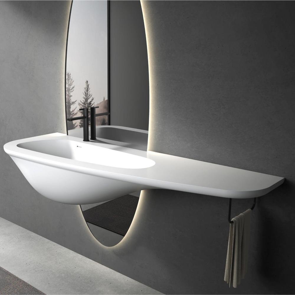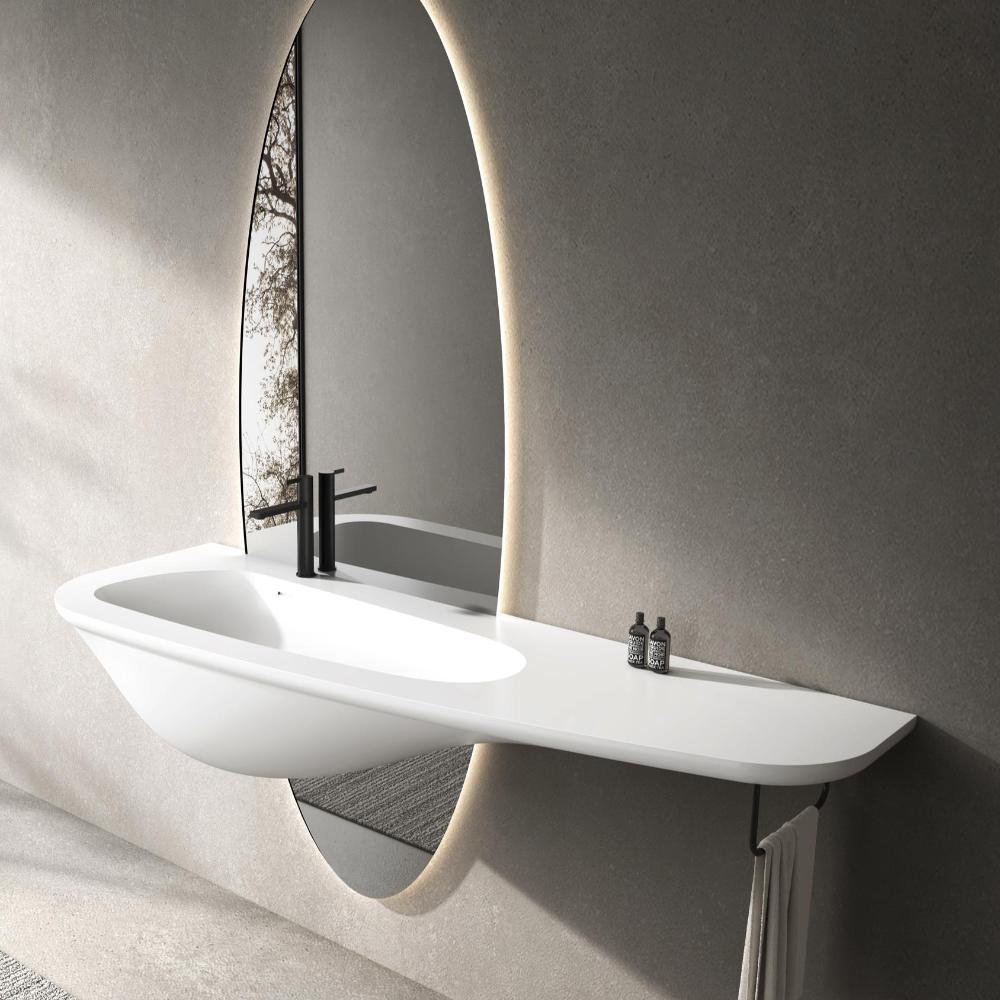 This solid surface vanity top combines minimalist aesthetics with full customization flexibility, offering versatile design solutions for modern bathroom spaces. Featuring an integrated, seamless construction, the basin and countertop are molded into one piece, creating a clean and refined visual appearance.